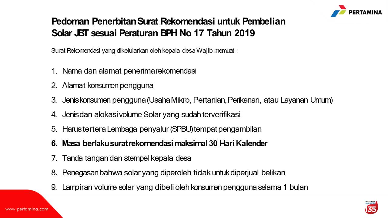 Pedoman Penerbitan Surat Rekomendasi Untuk Pembelian Solar JBT