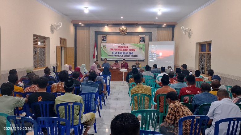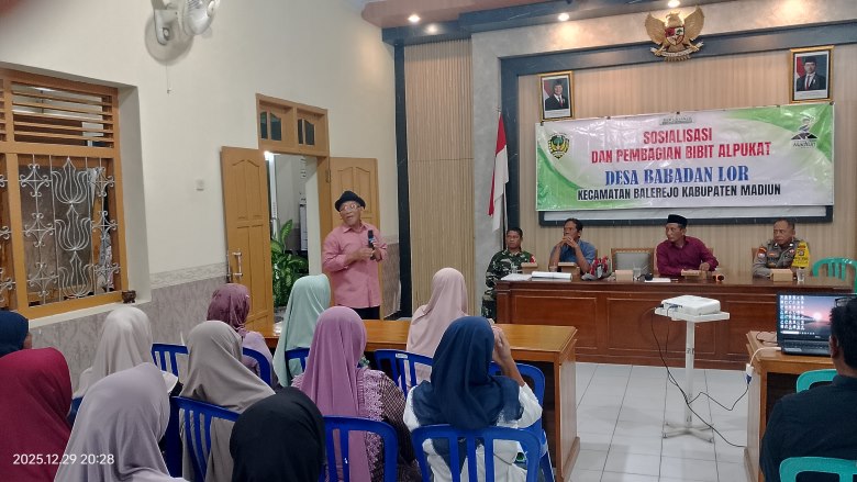 Pemerintah Desa Babadan Lor, Kecamatan Balerejo, Kabupaten Madiun, melaksanakan kegiatan Sosialisasi Gerakan Satu Rumah Satu Pohon sekaligus pembagian bibit alpukat pada Senin malam, 29 Desember 2025, bertempat di Ruang Pertemuan Kantor Desa Babadan Lor, mulai pukul 19.30 WIB.